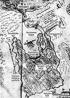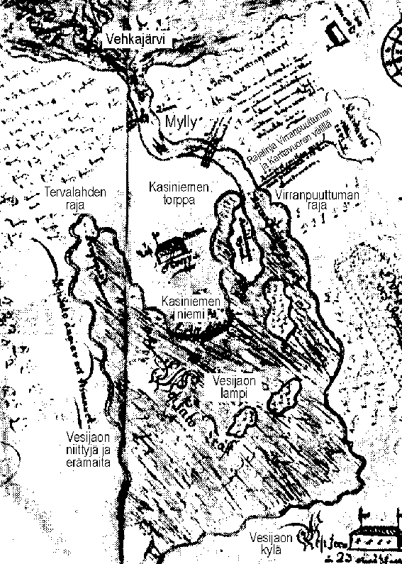 Kasiniemeläiset ovat aina ajatelleet, että Kasiniemi on, jos nyt ei aivan maailman napa, niin varsin huomattava ja tärkeä kylä Padasjoen luoteiskulmassa. Tuohan Kasiniemeen elävyyttä monen naapurikylän ja jopa naapurikunnan asukkaat. Tai ainakin ennen toivat. Tosiasiassa Kasiniemi omana kylänään on Padasjoen nuorimpia kyliä. Se kuului vielä keskiajalla Vesijaon kylään Skytän torppana. Vuonna 1588 annetulla tuomiolla vahvistettiin Kasiniemen torpan ja Vesijaon kylän väliset rajapisteet (varsinaisesti rajoja ei käyty). Rajapisteiksi vahvistetiin "Tervalahden raja" ja "Virranpuuttuman raja". Oheinen kartta liittyy tähän rajatuomioon. Kartasta ilmenee monia mielenkiintoisia asioita, vaikka kartta itsessään ei ole missään mittakaavassa oleva kartta, vaan lähinnä asioita selvittävä piirros. Kasiniemen torppa sijaitsi siis nykyisen Multatöyryn kohdalla. Kartasta ilmenee, että Ruhansillan kohdalla on jo silloin ollut joko jonkinlainen silta tai lossi. Edelleen selviää, että nykyisellä paikalla on jo silloin ollut mylly. Erityisesti kiintyy huomio siihen, että Puuksamenniemi on kuvattu lähes saarena sillä tavoin, että Multatöyrynlahti ulottuu Seppälän pajan kohdalle, johon jää vain hyvin kapea kannas. Kuinka asia on ollut? Vedethän olivat aikaisemmin nykyistä korkeammalla ja kun alue lahden pohjukasta pajalle on alavaa suoaluetta, saattaa olla, että kartta on oikein. Vaikka kartta on lähinnä piirros, niin kun ko. paikka on hyvin lähellä tuomion kohteena ollutta Virranpuuttuman rajapistettä, niin karttapiirroksen laatija on varmaan käynyt paikalla. Yksi mahdollisuus on, että paikan päällä on oltu talvella ja vesialueeksi merkitty alue on ollut lumen peittämää puutonta suota. Tuuliviirinä on jo silloin käytetty kukkoa. Näin näyttäisi Kasiniemen torpan kuvasta päätellen olleen. Heikki Hakkila