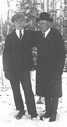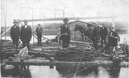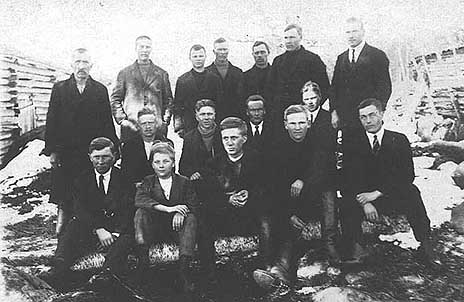 Keväiset uitot olivat hyvin huomattava miesten työllistäjä. Kalle Annaniemikin oli vuosikaudet uitoilla mukana, eikä ainoastaan oman kylän kohdalla vaan jatkoi kauemmaksikin. Kun puutavara oli saatu Ylä- ja Alavirran ohitse väljemmille vesille, koottiin tukit lautoiksi, joita hinattiin kohti Palsanojaa joko miesvoimin keluuveneellä tai hevosvoimin ponttoonilla. Hevosponttooni toimi siten, että siihen suuntaan, mihin oltiin menossa soudettiin vahvan köyden päässä ollut iso ankkuri ja laskettiin niin, että se tarttui hyvin pohjaan. Köyden toinen pää tuli ponttoonilla olevaan tukkiin. Hevonen kiersi ympyrää, jolloin köysi kiertyi ja kiristyi tukin ympäri ja ponttooni ja siihen kytketty tukkilautta kulkivat pikkuhiljaa eteenpäin. Aino A. arveli, että kuvassa kasiniemeläisiä oli joku Riihilahden mies. (Kuva yllä)