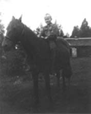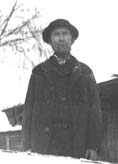 | Lauri Valkama reilut 60 vuotta sitten Valkaman pihassa. Taustalla näkyy Vuohisaaresta siirretty pirtti. |